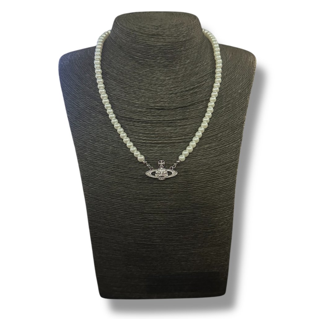 COLLARES DE PERLAS DE VIDRIO «VIVIAN» CON DIJE PLATEADO CON STRASS