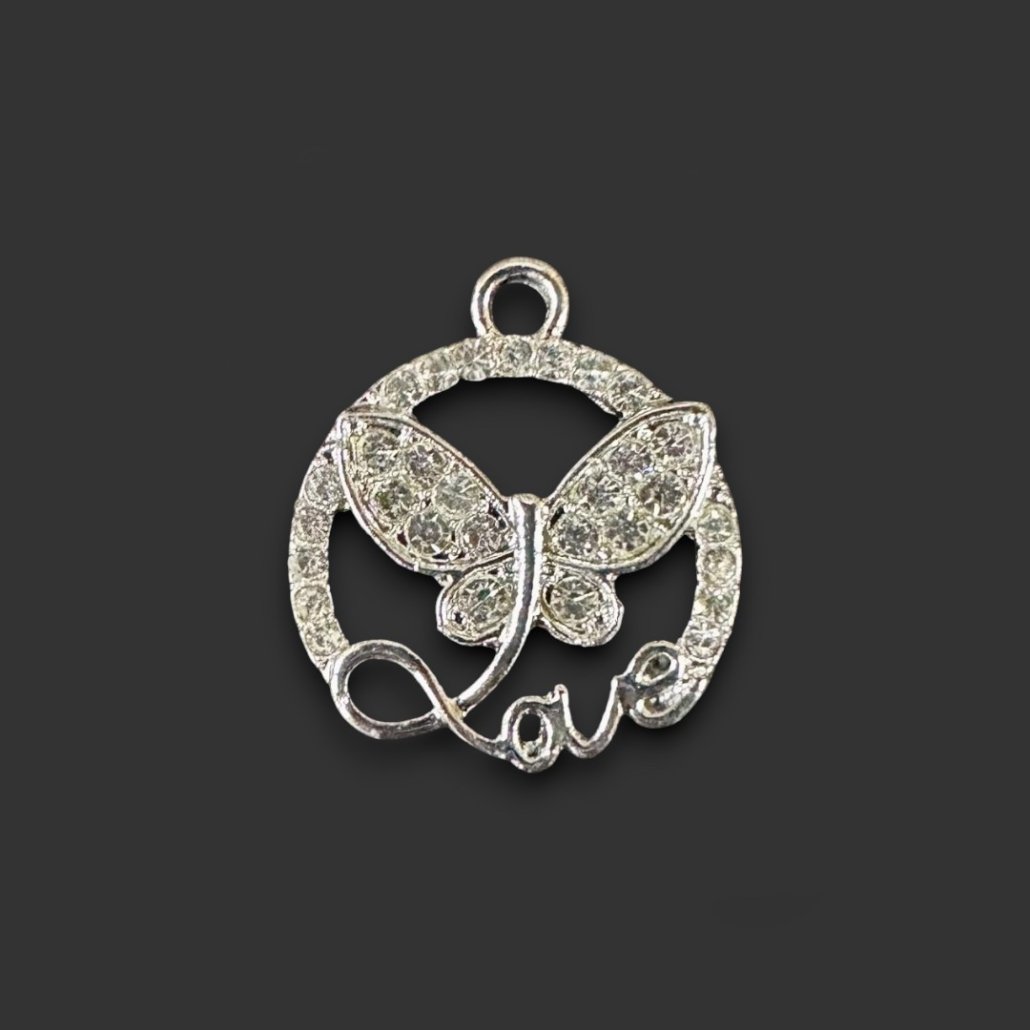 FORNITURA – DIJE PLATEADO CON FORMA DE MARIPOSA CON STRASS DIAMETRO 16MM