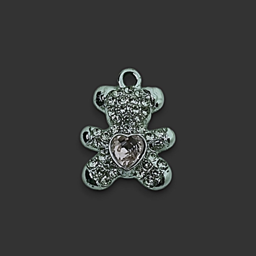 FORNITURA – DIJE PLATEADO CON STRASS CON FORMA DE CORAZON ROSE- MEDIDA 20x15MM