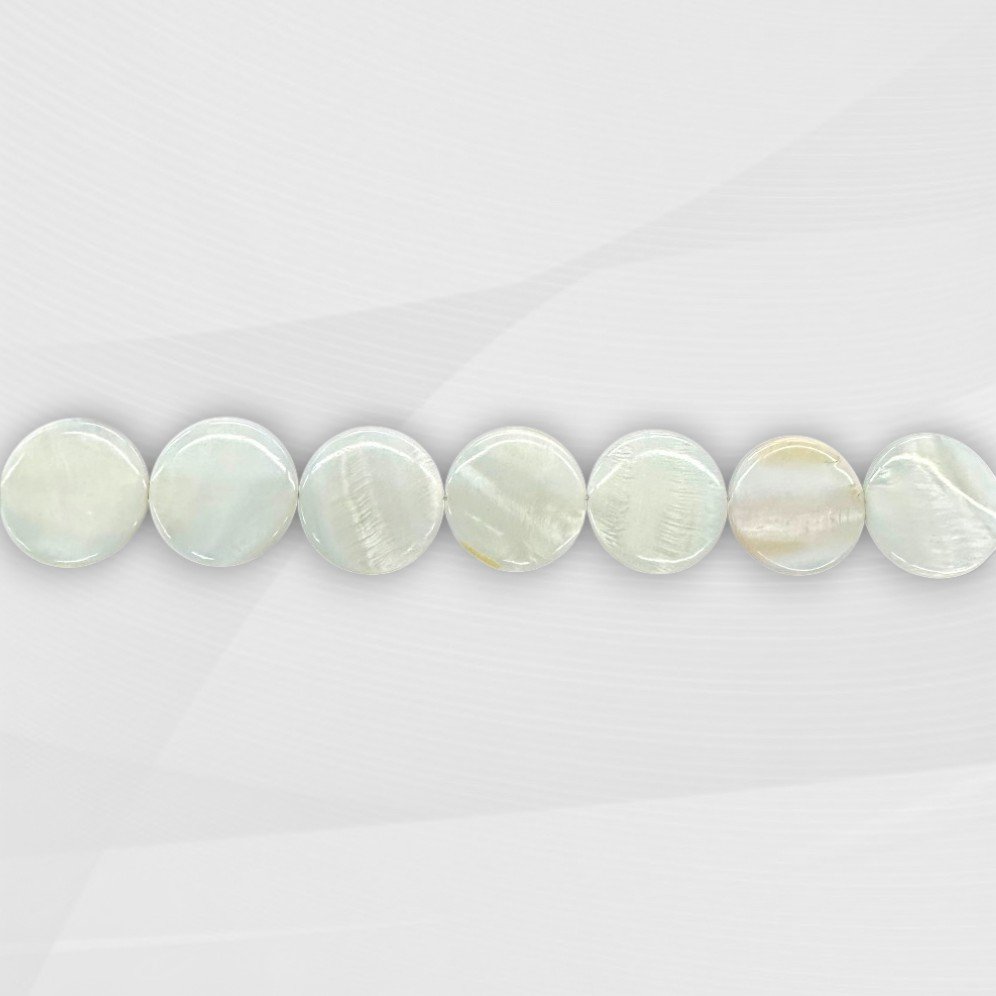 HILOS DE NACAR COLOR NATURAL DE FORMA PASTILLA CIRCULAR 18MM LARGO 40CM (APROX. 20 UNIDADES x TIRA)