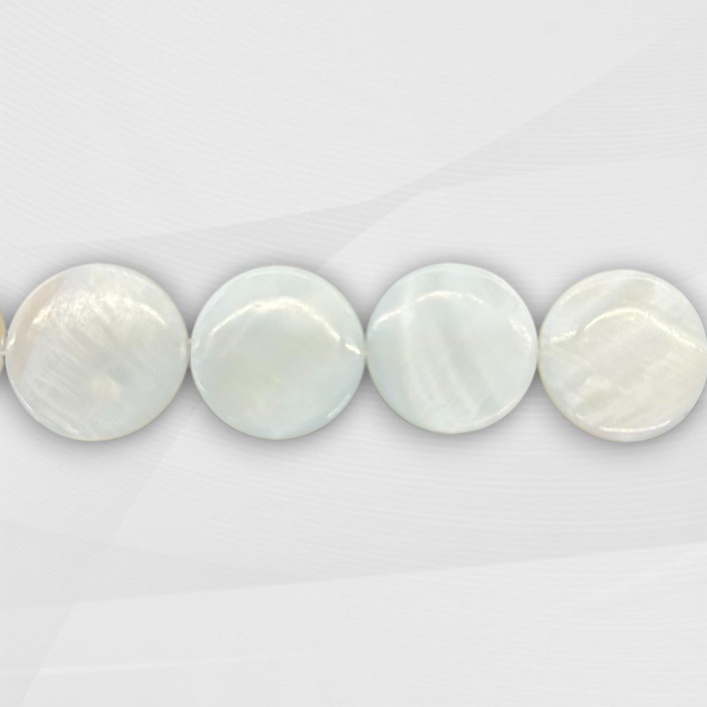 HILOS DE NACAR COLOR NATURAL DE FORMA PASTILLA CIRCULAR 30MM LARGO 40CM (APROX. 12 UNIDADES x TIRA)