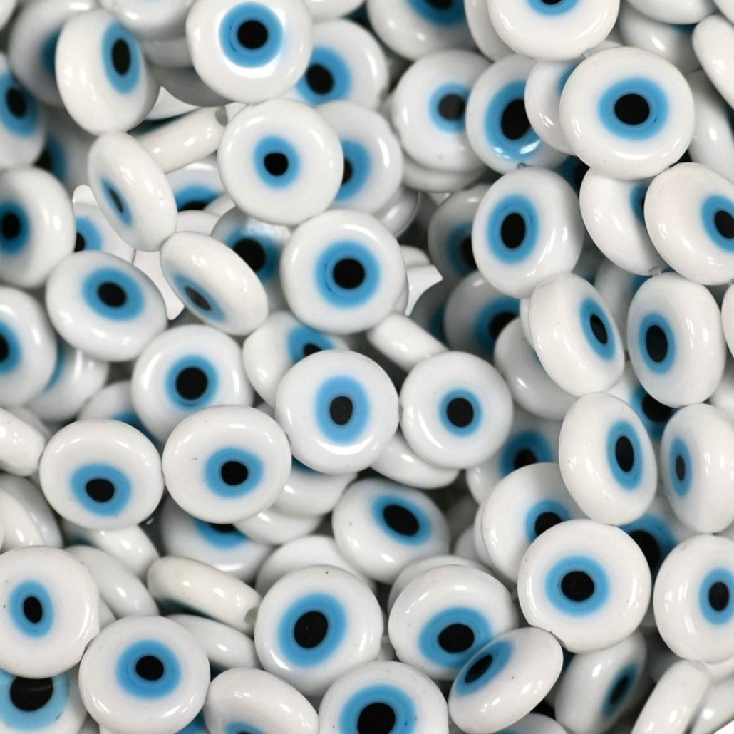 OJO TURCO 10MM PASTILLA (REDONDO PLANO) COLOR BLANCO HILOS x 36 UNIDADES