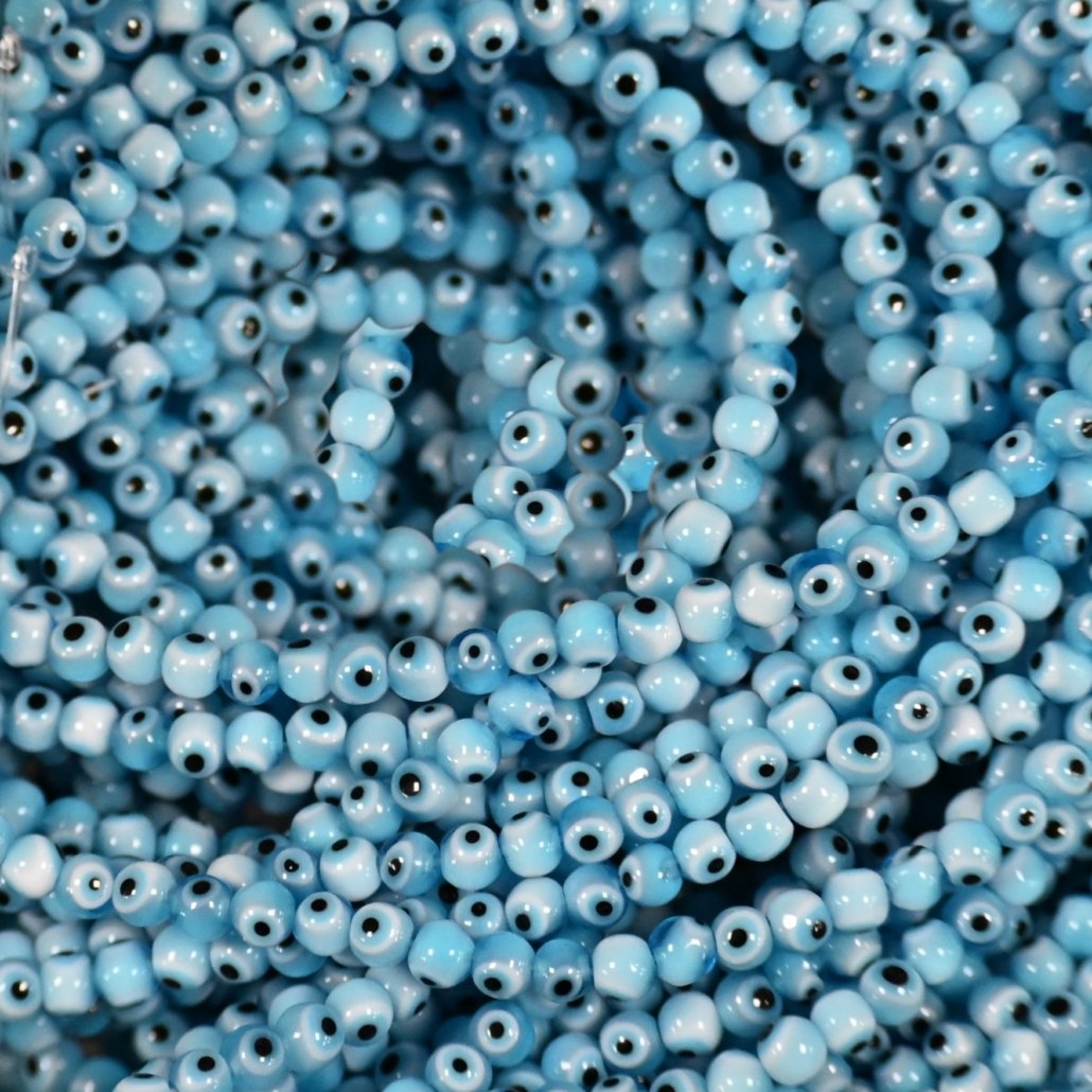 OJO TURCO 4MM REDONDO DE VIDRIO COLOR CELESTE HILOS x 90 UNIDADES