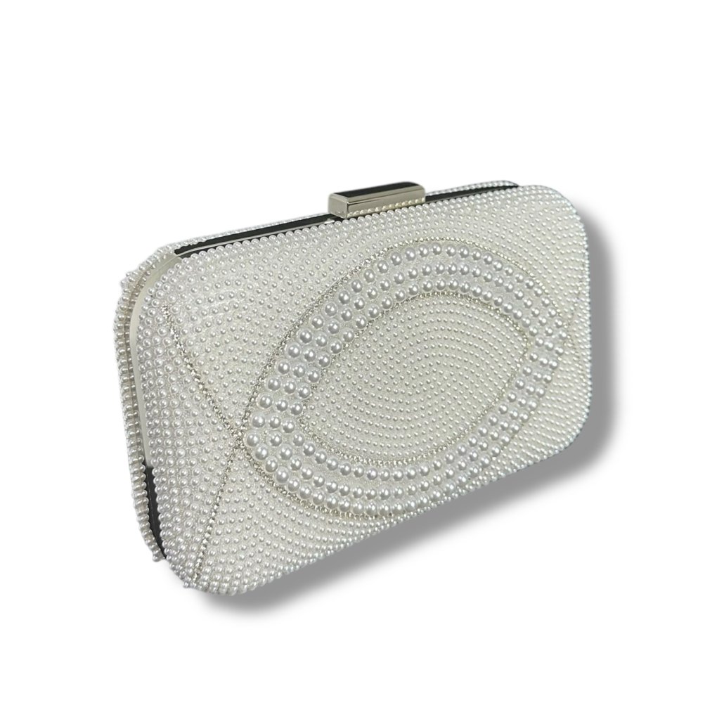CARTERA CON PERLAS DE VIDRIO PLATEADA CON CADENA PARA COLGAR