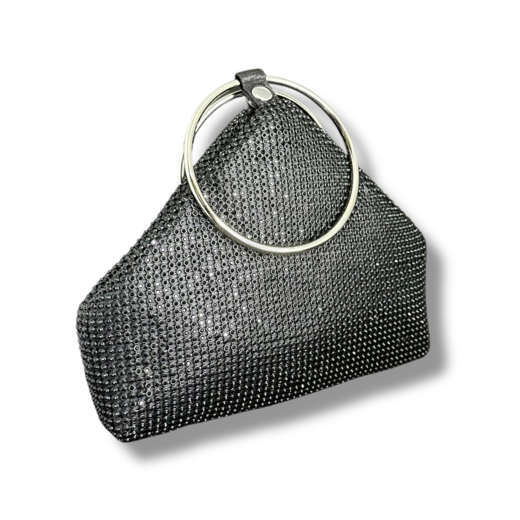 CARTERA DE STRASS COLOR NEGRO PLATEADA CON CADENA PARA COLGAR